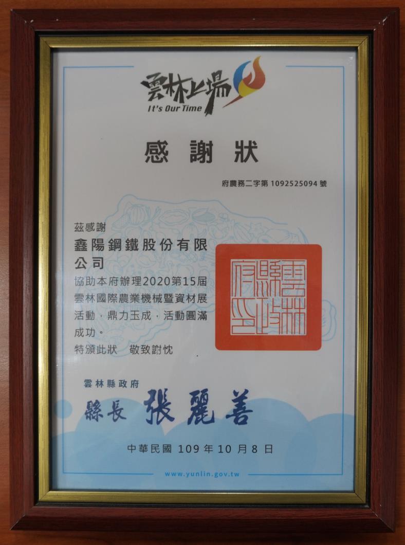 雲林縣政府為感謝本公司協助辧理 2020 第 15 屆雲林國際農業機械暨資材展活動於 2020 年 10 月 08 日特頒「感謝狀」,以表謝忱。